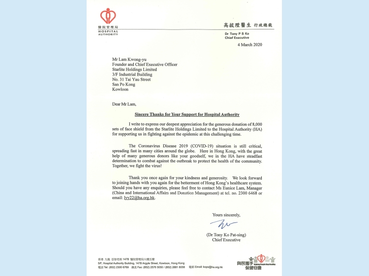 星光集团名义捐赠医院管理局8000套面罩,以支持抗疫一线医护人员的工作。