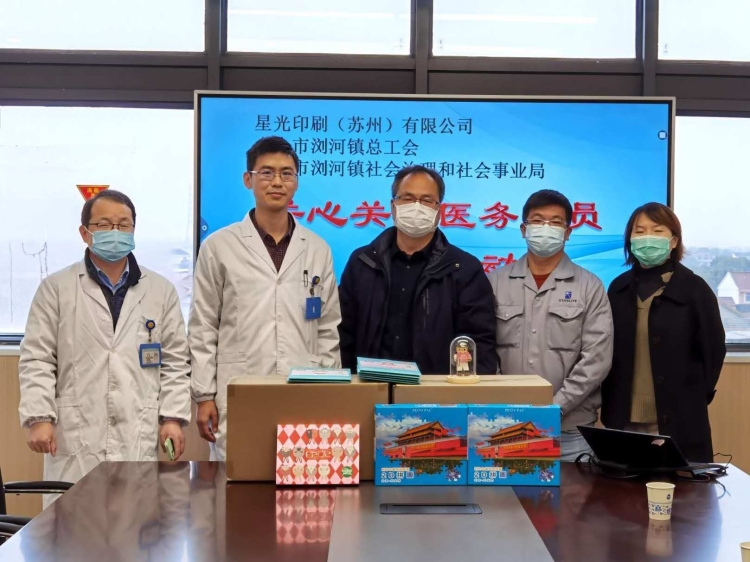 星光苏州与总工会一起赠送防疫产品以及绿团兔年日历给予当地医院。